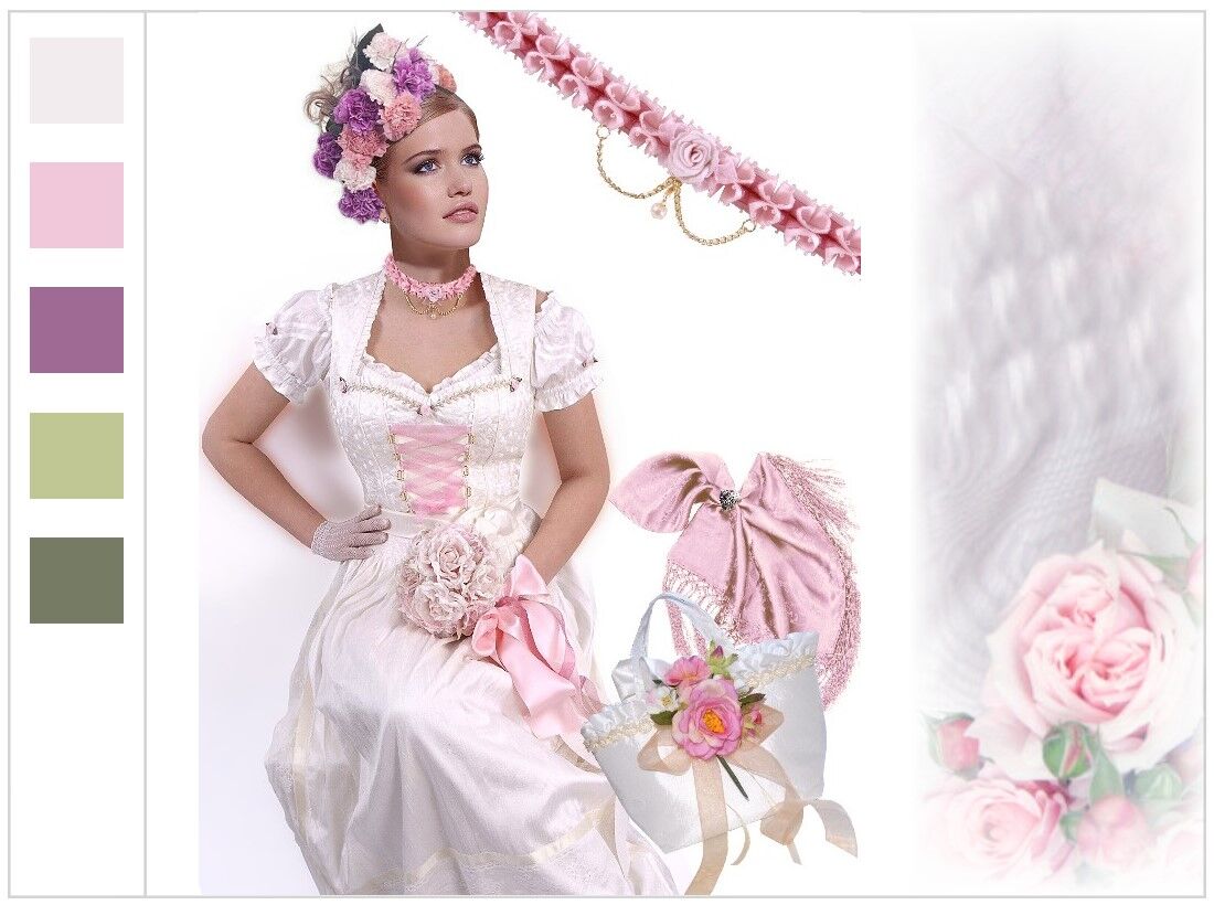 Premium Hochzeits-Dirndl / Festtagsdirndlhimmlisch romantisch mit Stil und NoblesseBildschönes Designer-Dirndl – das Ganze verpackt in einen Traum aus Rosé….märchenhaftes Dirndl zum Verlieben schön - dieses romantische Designer-Dirndl mit der zärtlichen Farbe Rosé/Lindgrün bringt hierfür alles mit. Dieses Traum-Dirndl wurde mit vielen wunderschönen Details gekonnt akzentuiert.Mit einen fröhlichen und hellen Style zaubert es die richtige Portion Romantik-Flairund unterstreicht somit gekonnt die feminine Weiblichkeit.Dieses märchenhafte Designer-Dirndl steht für pure Romantik sowie einen gewissen Flair von Noblesse - gerade richtig für die anspruchsvolle Trachten-Lady.Dirndl-Mieder - Zarte Satin-Organza-Röschen wetteifern mit dem dezenten Blüten-Dessin des Mieders und lenken den Blick auf das wunderschöne Decolletté.Silbrige Dirndlhaken mit Glitzer-Strass und grünem Satinband zieren zusätzlich die Miederschnürung.Dirndlschürze - Die allover bestickte Tüllspitze in verspielter - romantischer Optik legt sich transparent über den edlen Satin-Jacquard und begeistert so mit duftiger Leichtigkeit.Auch der Rocksaum am Dirndl wurde aufwändig mit zartem Lindgrün dekoriert. Rock - edler Trachten-Jacquard wie MiederDirndlbluse - eindrucksvolle Dirndlbluse mit duftigen Georgette-Ärmeln – das verleiht jedem Look das gewisse Etwas!Die fesche Spitzen-Verarbeitung an den Ärmeln lässt verführerisch die Haut durchblitzen und überzeugt mit elegantem Sexappeal.Dirndl komplett mit Schürze + Bluse