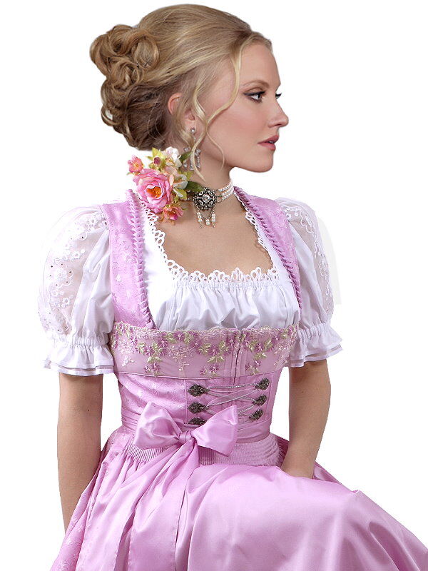 Glamouröses Designer-Dirndl in Rose-Flieder... himmlisch zart mit Feingefühl für Stil und EleganzDieses herrliche Designer-Dirndl wirkt umwerfend attraktiv mit unvergleichlich eleganter Nuance.Kostbar und schmeichelnd wirkt das edle Rose im Mix mit elegantem Schwarz. Zwei schillernde Farbtöne, die sich ganz wunderbar ergänzen.Romantisch edles Couture-Dirndl - dieses Dirndl ist unbeschreiblich weiblich mit subtilem Charme.Die feminine Raffinesse zeigt sich bis ins kleinste Detail mit wirkungsvollen Glitzer-Highlights.Ein echter Traum für Damen, die es gewohnt sind, das Schönste zu tragen!Besonderheit - Es ist die Vorliebe für Exklusives, die sich im eleganten Stil äußert.Mit diesem prachtvollen Designer-Dirndl werden Sie auf jeden Fall alle Blicke auf sich ziehen!Qualität – sehr hochwertig – edel & exklusivDirndl-Mieder - als Eyecatcher wirkt die erlesene Mieder-Stickerei im hübschen Blüten-Design der Schürze. Eingearbeitete Mieder-Stäbchen bringen den perfekten Sitz.Dirndlschürze - Schürze aus kostbarer Couture-Spitze die auf zartem, Gold schimmernden Organza gestickt wurde,umgibt ihre Trägerin mit einer Aura der Faszination und duftiger Leichtigkeit. Rock - herrlich leicht und fließend - das garantiert der geschmeidige Viskose/Leinen Mix.Der wunderschönen Fall sorgt für eine schlanke Figur umschmeichelnde Linie.Dirndlbluse - Als zusätzliches Highlight wirkt hier die edel bestickte Carmen-Bluse mit Pailletten-Verzierungen.Dirndl komplett mit Schürze und Bluse